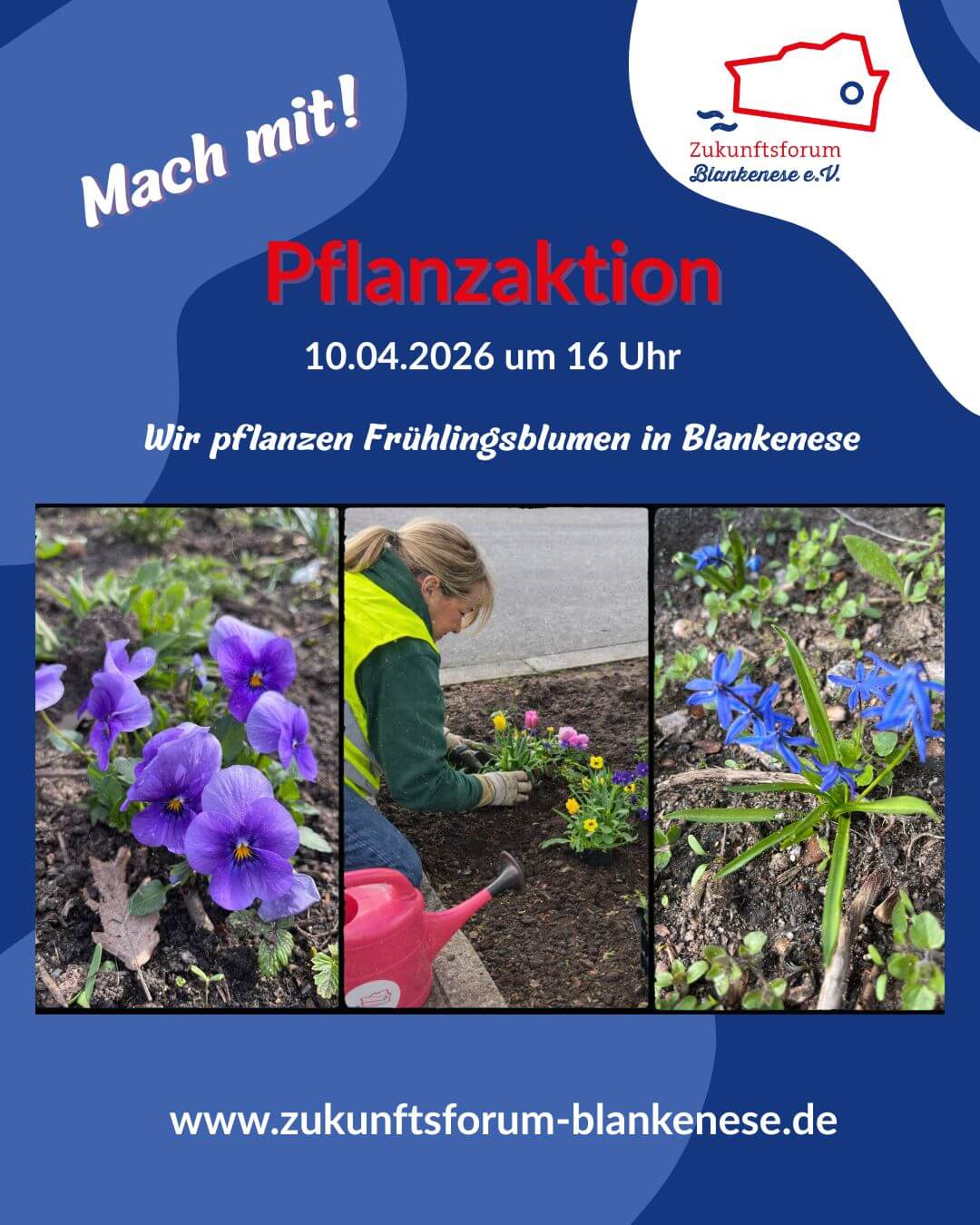 Am 10.04.2026 um 16:00 Uhr laden wir Sie zu unserer jährlichen Frühlings-Pflanzaktion für jedermann ein. Treffpunkt ist der Marktplatz. Eine Anmeldung per E-Mail ist nicht erforderlich, aber erwünscht: info@zukunftsforum-blankenese.de. Eine Pflanzaktion mit den Campus Kindern der Buggenhagen Schule findet am gleichen Tag um 10:30 statt.