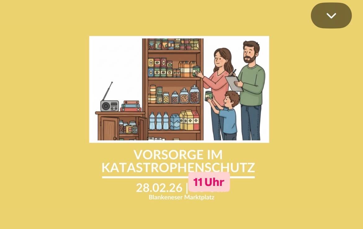 Am 28.02.2026 werden wir im Rahmen des Tages des Zivilschutzes um 11:00 Uhr eine Aktion auf dem Marktplatz durchführen, um über die neue Broschüre „Vorsorgen für Krisen und Katastrophen” des Bundesamtes für Bevölkerungsschutz und Katastrophenhilfe zu informieren. Wir werden einige Broschüren bereithalten und wichtige Informationen dazu bereitstellen. Kommen Sie vorbei und kommen Sie mit uns ins Gespräch.